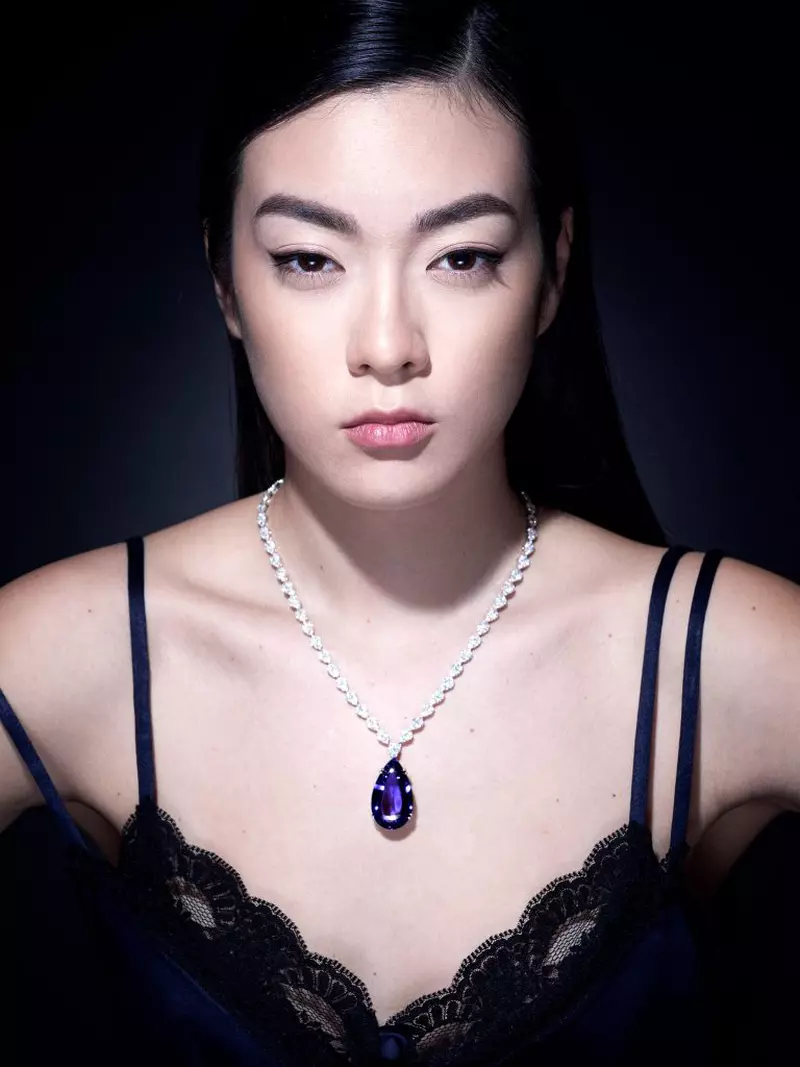 Și apoi se întâmplă magia: nu-mi pot dezlipi privirea de un colier statement, genul acela de bijuterie pe care o vezi purtată de prințese și regine. Și este chiar aici, în fața mea. O piesă cu totul și cu totul deosebită, iar când spun asta nu mă refer doar la design. În centrul ei tronează un tanzanit de 24 de carate, cu tăietură pară. Nuanța lui superbă de albastru e pusă în evidență de o mulțime de diamante impecabile.