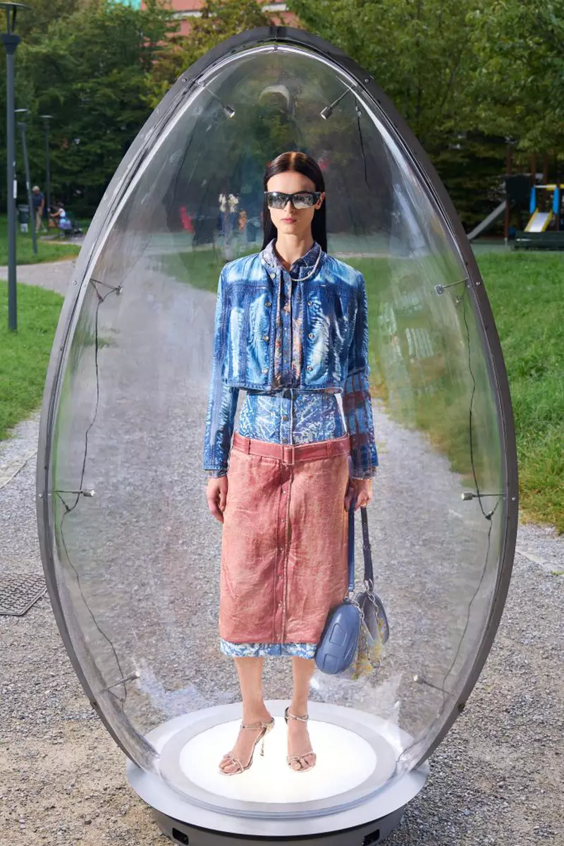 Fiecare piesă este Diesel la un alt nivel, cu și mai multe tratamente, mai multă experimentare, mai multă purtabilitate și joacă. Rochiile tip șorț sunt din jacquard de satin denim distressed', iar Diesel a dezvoltat propriul satin denim, gravat cu laser pentru a crea efecte uzate. Satinul denim, în culori vii, este realizat din poliester reciclat și este folosit pentru jachete biker fără mâneci, topuri tip șorț, rochii fără mâneci și paltoane cu detalii de curele biker deconstruite.