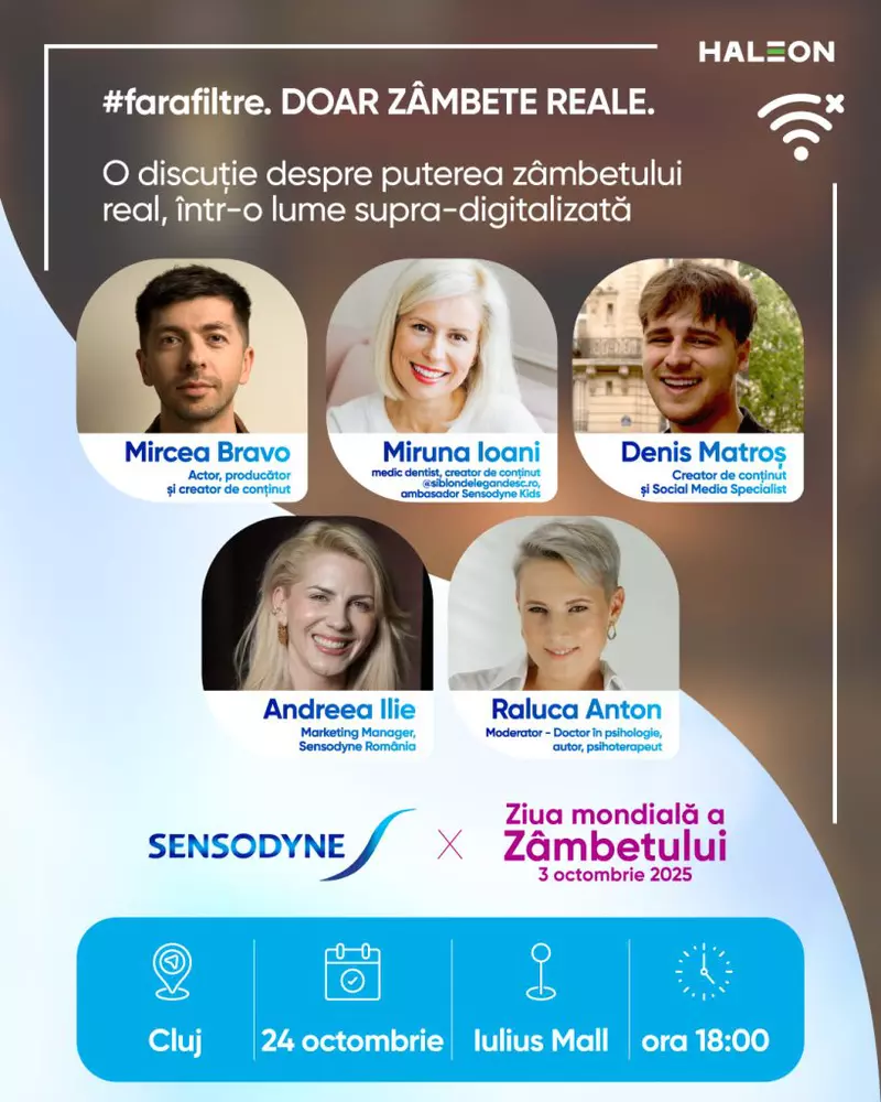 Pe 24 octombrie, de la ora 18:00, campania #fărăfiltre.Doar zâmbete reale ajunge la Cluj-Napoca, în Iulius Mall, unde Mircea Bravo, actor, producător și creator de conținut, Miruna Ioani, medic dentist, creatoare de conținut și ambasador Sensodyne Kidsmedic dentist și creatoare de conținut, Denis Matroș, creator de conținut, și Andreea Ilie, Marketing Manager Sensodyne România, vor continua dialogul despre zâmbete reale și conexiuni autentice. Conversația va fi moderată de Raluca Anton, doctor în psihologie, autor și psihoterapeut, într-o seară dedicată redescoperirii bucuriei de a zâmbi dincolo de filtre și ecrane. Discuția poate fi urmărită și live pe canalul de YouTube și pagina de Facebook ELLE România.