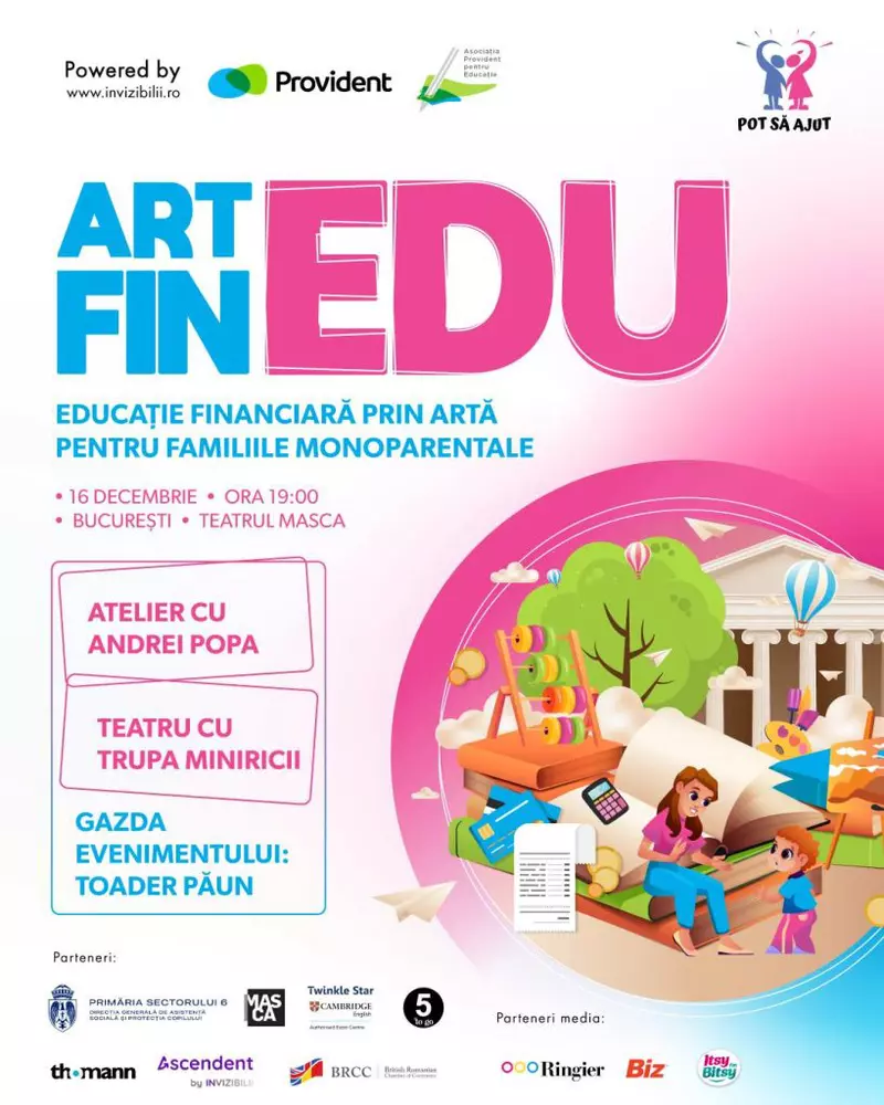 Marți, 16 decembrie, la Teatrul Masca din București, familiile monoparentale din cadrul Direcției de Asistență Socială și Protecție a Copilului Sector 6 sunt invitate la ArtFinEdu, un eveniment inedit în care noțiunile financiare sunt explicate prin joc, teatru și povești accesibile copiilor și părinților.