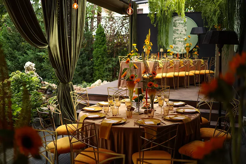 Cifrele vorbesc: cuplurile din 2026 aleg iluminarea ca element de design principal (aranjamente de lumânări grupate, ghirlande de lumini discrete și iluminare ambientală subtilă), care reflectă personalitate și experiența gastronomică ca show central – meniuri degustare, prezentări care transformă masa în moment culinar.