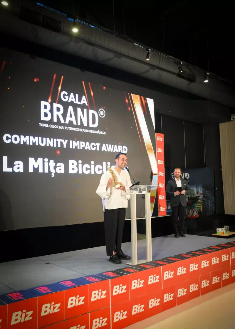 BrandRO Community Impact Award a fost obținut de La Mița Biciclista, cofondatorul Edmond Niculușcă primind trofeul de la Sabina Știrb – Marketing Director Romania & Bulgaria Multi-Country Business Department, HONOR Technologies.