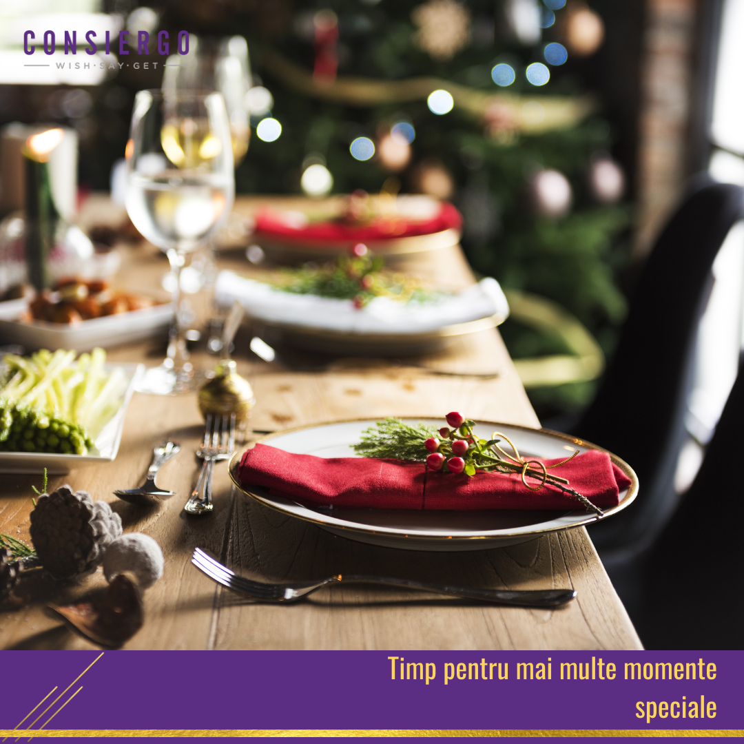 Ajutor la pregătirea mesei de Crăciun. Consiergo îţi poate livra, la timp şi conform cerinţelor tale, o masă completă de Crăciun. Sau îţi poate aduce acasă un chef bucătar care să satisfacă toate poftele culinare ale familiei. Dacă vrei să faci o bucurie şi părinţilor, ai posibilitatea să îi ajuţi prin livrarea cumpărăturilor sau chiar a preparatelor tradiţionale pentru masa de Crăciun.