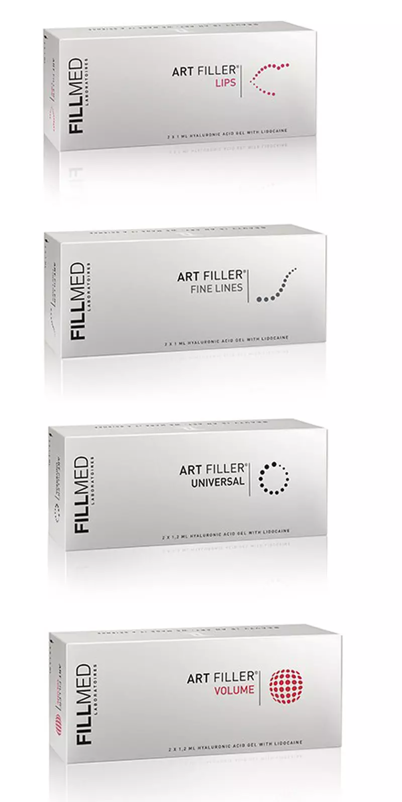 Fillerele mele preferate sunt, de asemenea, din gama FILLMED. Gama ART FILLER conține 5 texturi ușor de modelat: FINE LINES, UNIVERSAL, LIPS, LIPS SOFT, VOLUME. Sunt create pentru orice zonă de injectare: riduri fine, buze, riduri medii-profunde sau pentru restabilizare de volum. Apreciez foarte mult eficiența, remanența lor și efectul subtil și natural. De altfel, acesta este unul dintre obiectivele mele principale. Personal, nu încurajez intervențiile exagerate.