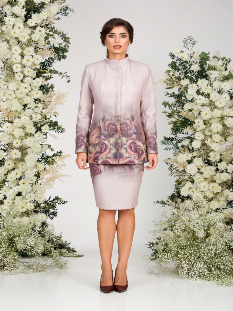 Un model în nuanțe de bej elegant cu imprimeuri digitale florale va arăta spectaculos în orice situație. Haina este călduroasă, iar croiala ușor cambrată pe corp subliniază silueta în cel mai distins mod. Datorită sistemului de închidere cu nasturi ascunși, nu afectează cu nimic farmecul elementelor grafice. Imaginează-ți acest model în combinație cu un șir de trandafiri roșii imprimați la baza hainei! Cu siguranță vestimentația nu te va lăsa indiferentă!