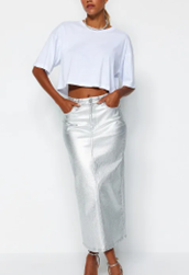 Această fustă maxi cu aspect metalizat este piesa de rezistență a look-ului. Cu un luciu argintiu intens, prinde perfect lumina reflectoarelor de pe scenă și îți oferă acel look futuristic, fără efort.