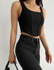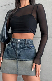 În plus, piesa de bază va fi o fustă mini din denim albastru deschis, cu croi strâns, care pune în valoare silueta și adaugă un aer casual și îndrăzneț.