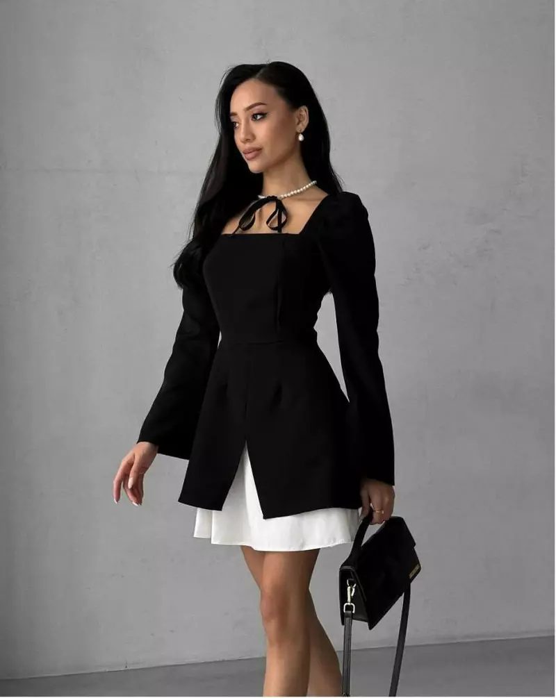 Tipul croielii: Modelul combină rigoarea sacoului cu o fustă petrecută lejeră. Mâneca lungă crăpată adaugă un efect dramatic de capă.