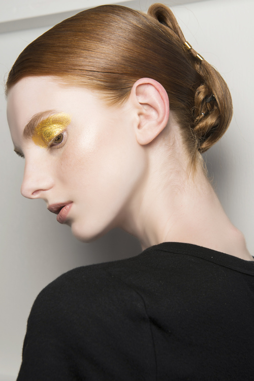 1.Ne-ar placea la nebunie sa vedem un machiaj cu pleoape aurii, asortate unui ten palid (eventual, pe care nu a fost bronzat artificial) si asortat cu aceasta coafura eleganta, dar totusi atipica.