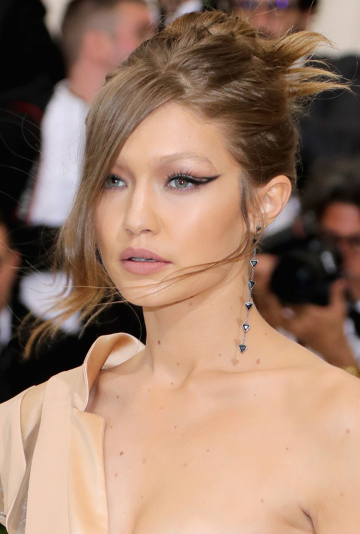 Gigi Hadid a gasit reteta ideala pentru tema serii cu un machiaj grafic, ten luminos, buze mate intr-o nuanta naturala si o coafura feminina, glam, dar totusi nefinisata.