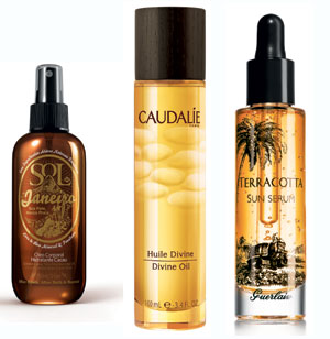 Solutii: ulei pentru sporirea si mentinerea bronzului Terracotta Sun Serum, Guerlain; ulei cu struguri, argan, hibiscus si susan pentru corp si par Divine Oil, Caudalie (in farmaciile Centrofarm) si Golden Cacao Silky Restoration Oil, Sol de Janeiro (in Sephora).