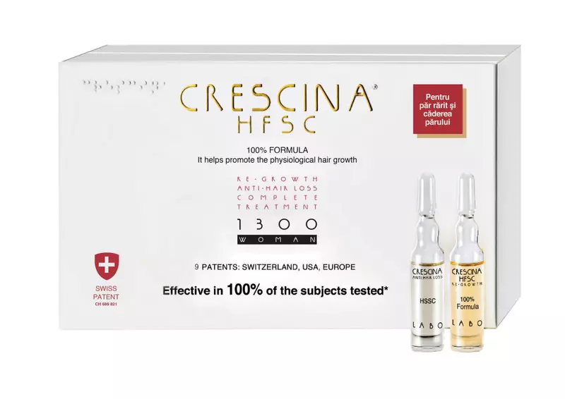 Crescina Anti-Hair Loss HSSC este o formulă prezentată sub forma unor fiole transparente, care acționează direct asupra foliculului pilos (pereți, gât și în jos) pentru a bloca desprinderea firului de păr și pentru a reduce pierderea masivă a acestuia. Formulele complexe Crescina Hair Loss fiole au la baza acid aspartic, hidroxiprolină și un activator enzimatic, pentru a elasticiza pereții foliculari și pentru a ancora bulbul în folicul, în timp ce taurina e un aminoacid ce determină o creștere a proliferarii celulelor tecii foliculare la nivelul coletului, ajutând la menținerea bulbului în locașul său, în interiorul foliculului.