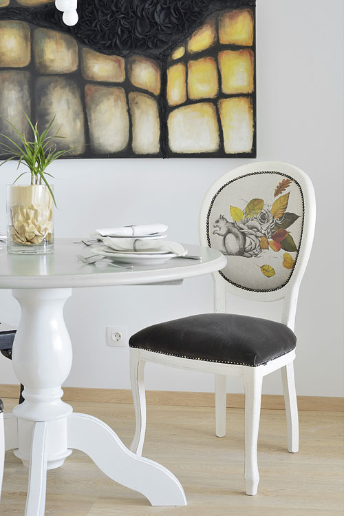In zona de zi sunt cateva piese IKEA si furnizori axati pe stiluri mai apropiate de zona country: Quadra pentru masa dining si masute de cafea, Everart pentru canapeaua extensibila, si brandul propriu, thecraftlab by Irina Neacsu, pentru scaunelul si fotoliul cu tapiteria personalizata si pentru pernele decorative.