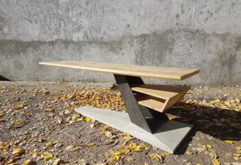 Un birou care îmbină 3 materiale într-o geometrie curajoasă în care blatul de lucru este susţinut într-o consolă generoasă de piciorul metalic, stabilitatea întregului ansamblu fiind asigurată de o bază de beton aparent. Contrastul între aceste materiale conferă obiectului un caracter aparte care stimulează atât vizual, cât şi tactil utilizatorul mesei. Complementar demersului creativ s-a urmărit şi componenta practică a piesei de mobilier, biroul fiind prevăzut cu un spaţiu de depozitare.