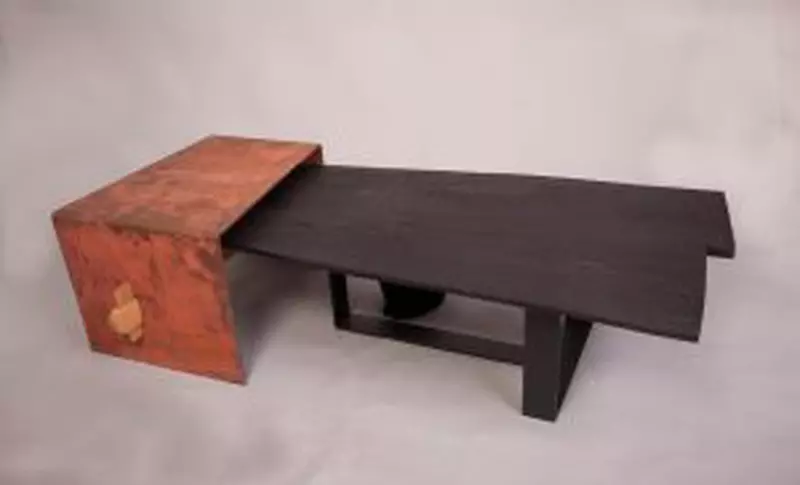 Demersul creativ în cazul acestei mese a plecat de la dorinţa de a experimenta cu materiale speciale prin textura şi transformările pe care acestea le suportă în timp. Astfel, am ales cuprul pentru modul în care acesta capătă patină specifică şi pentru al doilea blat de masa, lemn ars şi periat pentru textura deosebită a acestuia. Din alăturarea acestor 2 materiale se obţine un contrast dublu, atât cromatic, cât si tactil, metalul lis rece şi lemnul cald cu o textură profundă.