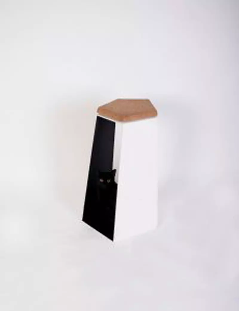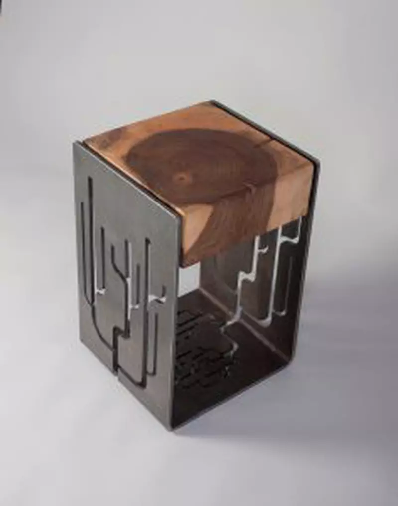 Materialele sunt cele care dau caracterul acestui obiect, contrastul dintre oţel şi plută se manifestă atât prin textură, cât şi prin diferenţa cromatică. Forma de trunchi de piramidă cu cele 2 laturi înlăturate permite obţinerea unui volum deschis şi finisarea diferită a suprafeţelor interioare şi exterioare.