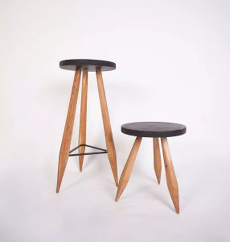 Taburetul TRIPOD reprezintă o reinterpretare a scaunului tradiţional. Pornind de la acesta, seria Tripod dezvoltă diferite forme ale acestuia traspuse în utilizări contemporane ale acestuia în ipostazele de scaun de bar, măsuţa de cafea şi taburet. Taburetul este alcătuit dintr-un şezut de stejar obţinut dintr-o singură scândură de stejar băițuită, selectată cu atenţie pentru a pune în valoare desenul spectaculos al acestui tip de lemn care este utilizat şi pentru obţinerea picioarelor , forma acestora este obţinută manual.