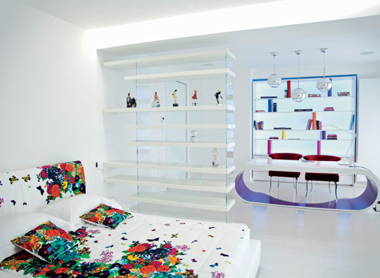 Dormitor: in prim plan, pat Kenzo, biblioteca Lago, birou Goggle – Babini, corpuri de iluminat Tom Dixon; in plan indepartat, biblioteca custom-made High Class Design.