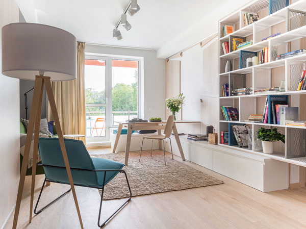In living, Vertigo Design a realizat bibliotecile din tabla expandata, iar Kaustik a realizat masa rabatabila, care urca pe perete atunci cand nu este nevoie de ea.