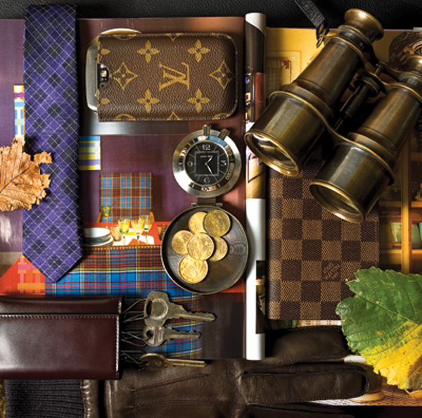 Cravata din matase, Man & Manetti, 161 lei; etui de telefon mobil din piele, 720 lei, si portofel din piele, 1.000 lei, ambele Louis Vuitton; port-chei din piele, Canali, 500 lei; ceas de birou, Cartier, 2.587 lei, manusi din piele, Maison Martin Margiela, 565 lei, Raionul 4; binoclu, 350 lei, British Gallery;