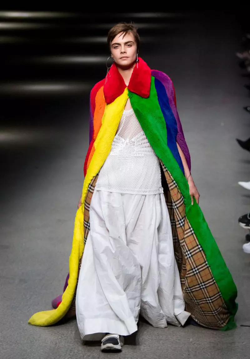 Iar hainele din colecția Burberry Fall 2018, foarte colorate și optimiste, au fost inspirate atât de arhivele bogate ale casei (ținutele au inclus elemente care au fost realizate în anii ’60 și ’70), cât și de nuanțele curcubeului. Mai precis, ale steagului LGBT creat de Gilbert Baker în San Francisco în 1978. La momentul la care a fost gândit, acesta simboliza diversitatea comunității LGBT, iar steagul a fost apoi recunoscut internațional drept un simbol al paradelor gay din toată lumea și al luptei pentru drepturi egale. Astăzi, un astfel de steag stă la muzeul de artă modernă din New York (MoMA) ca obiect de design cu o încărcătură simbolică aparte.