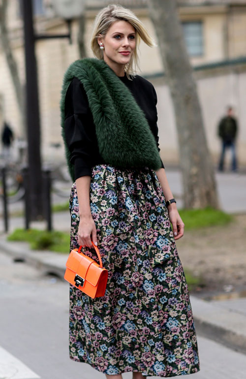 Fusta midi cu imprimeu floral, o geanta colorata si un guler de blana asezat peste o bluza in culori neutre care intregeste tinuta – se pare ca acestea sunt ingredientele perfecte pentru un outfit ladylike.