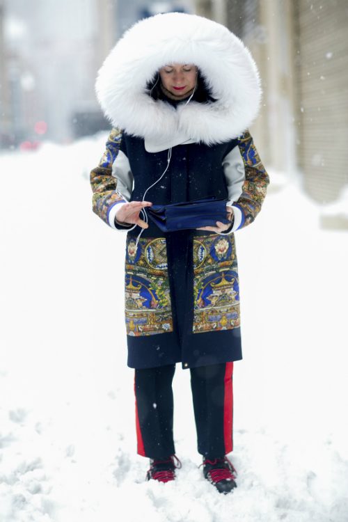 Regula generala este sa nu iti fie frig la cap si la picioare. Deci o gluga (sau o caciula) XXL din blana va rezolva problema in partea de sus, iar o pereche de bocanci seriosi de munte va avea grija de picioarele tale. In rest nu te sfii sa porti ce ai purta in mod normal si completeaza totul cu o maleta groasa din lana.