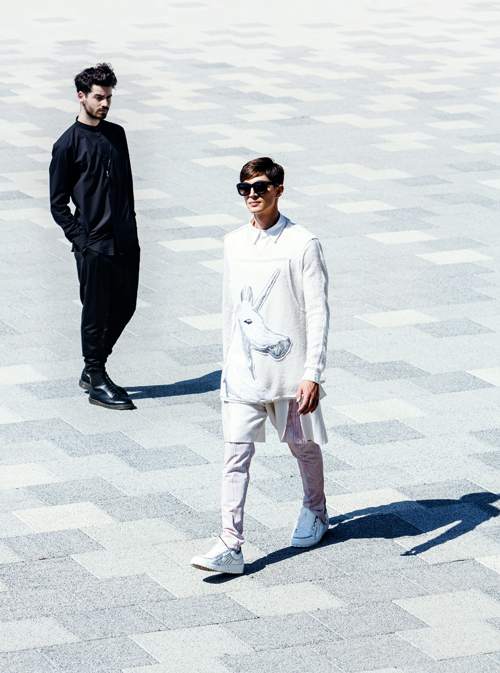 Top din stofa de lana, cu broderie manuala, camasa din matase si batist, pantaloni din doc imprimat digital si pantaloni scurti din lana, cu insertii de doc imprimat digital.