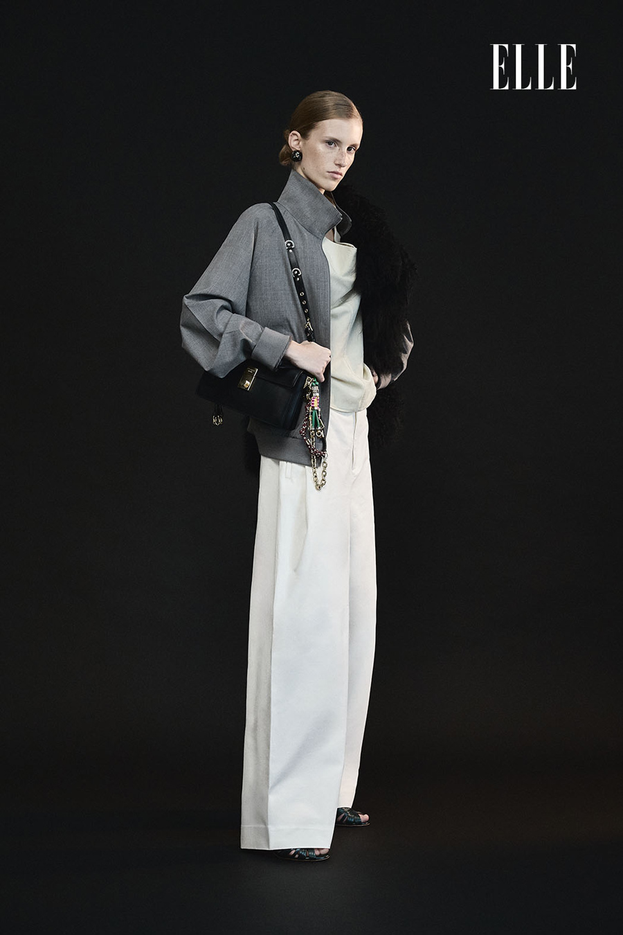 Jachetă și geantă Prada, ambele magazinul Mengotti; blană Ann Demeulemeester, magazinul Entrance; top și pantaloni COS; cercei magazinul Vintage Lady; pantofi Anna Field, www.zalando.ro.