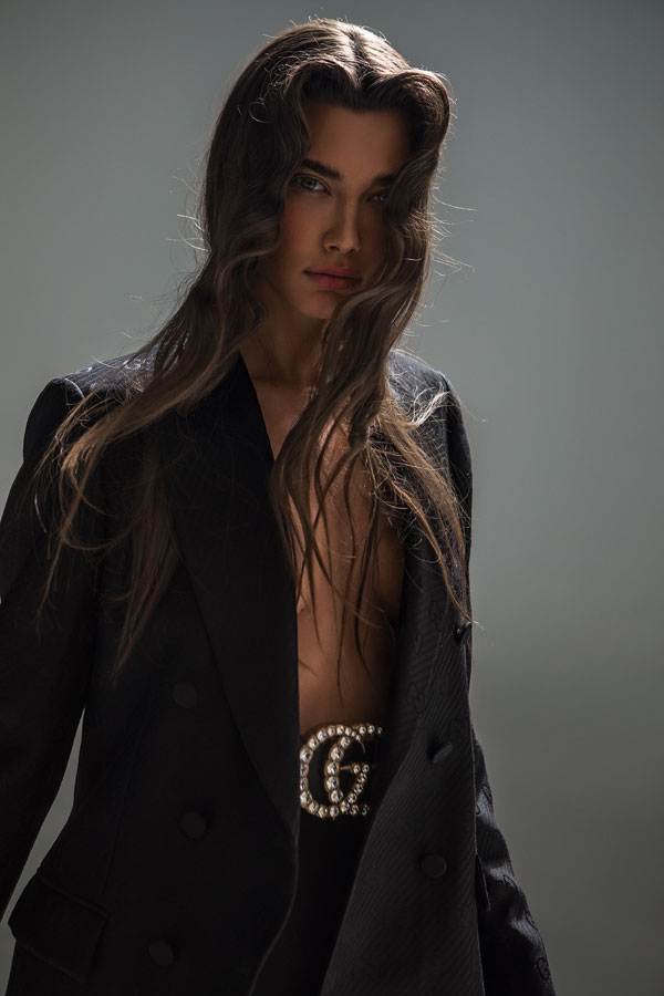 Blazer din stofă de lână, 12.440 lei, curea din piele cu cristale, 3.940 lei, și sandale din piele, 3.440 lei, toate Gucci; pantaloni din poliester, Alchemy, 600 lei.