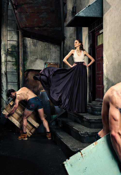 Rochie din matase, Diane von Furstenberg, 3.500 lei, magazinul Mengotti; costum de baie, I.D. Sarrieri, 550 lei; bratara din rasina, Yves Saint Laurent, 2.099 lei, si sandale din piele, Sergio Rossi, 3.899 lei, ambele magazinul Victoria 46. Bogdan (in toate fotografiile): jeans, Dsquared, 639 lei, magazinul Day&Night; bocanci din piele, Timberland, 1.166 lei; Andrei (in toate fotografiile): jeans, Dsquared, 1.679 lei; bocanci din piele, Timberland, 1.166 lei.