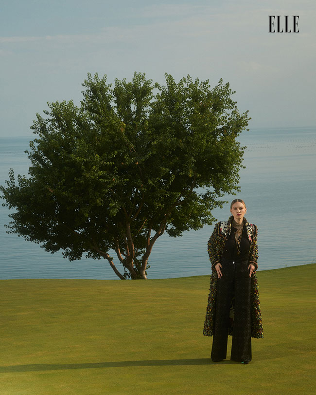 Look complet și accesorii din colecția CHANEL – DAKAR 2022/23 Métiers d’Art: Jachetă din dantelă și piele; Bluză cu mâneci lungi din jerseu de lână brodat cu mărgele, camelii și nasturi-bijuterie; Jeanși din denim brodat cu paiete; sandale cu platformă din piele și piele lăcuită.