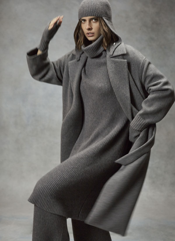 Rochie, pantaloni, căciulă și mănuși din lână, toate Ami Amalia, 971 lei, 1.174 lei, 286 lei și 217 lei, și palton din amestec de lână și cașmir, Max Mara, 5.390 lei.