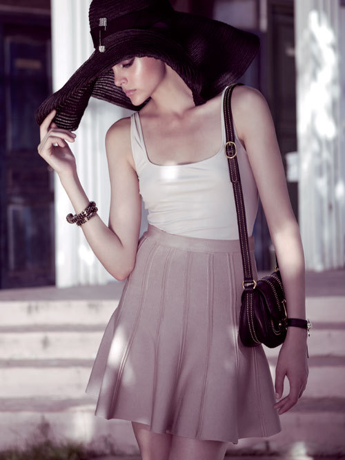 Body din elastan, I.D. Sarrieri,175 lei; fusta din elastan, Hervé Léger, 4.250 lei, The Place Concept Store; bratara metalica, Roberto Cavalli, 3.259 lei, bratara din piele cu aplicatie metalica, Givenchy, 807 lei, si palarie din pai, Lanvin, 3.049 lei, toate magazinul Victoria 46; geanta din piele, Gucci, 6.890 lei.