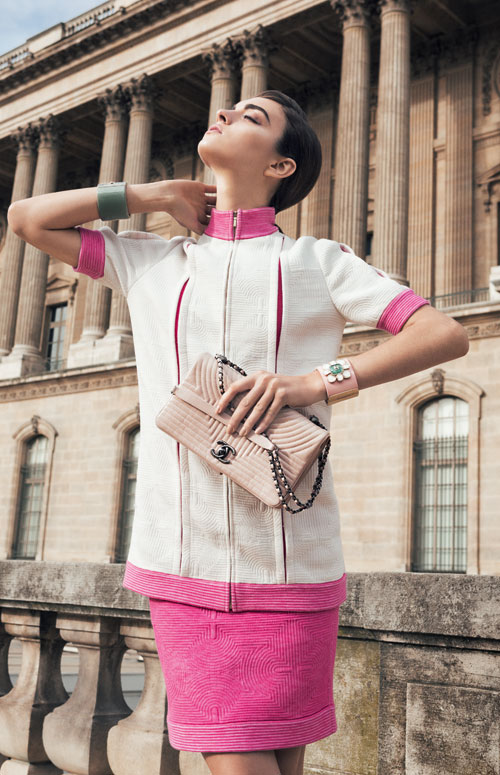 Cardigan si fusta din bumbac, bratari din rasina si perle si geanta Korean Garden, toate Chanel, din colectia Cruise 2015/2016 – Seoul.