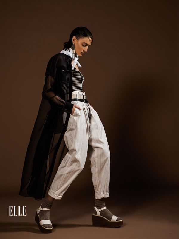 Top din mătase crispy cu volane, maiou din bumbac, pantaloni safari din in și bumbac și sneakers din piele cu monile, toate Brunello Cucinelli.