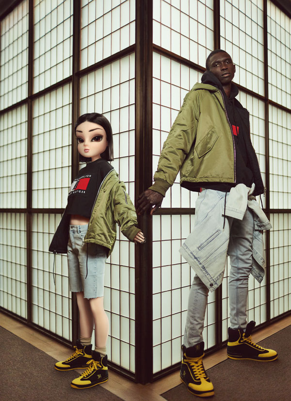 Noonoouri poartă jachetă și pantaloni scurți, ambele din denim, jachetă matlasată, teniși din piele, toate TommyXLewis, marca Tommy Hilfiger. Fernando poartă hanorac, pantaloni și jachetă, toate din bumbac, și teniși din piele, toate TommyXLewis, marca Tommy Hilfiger.