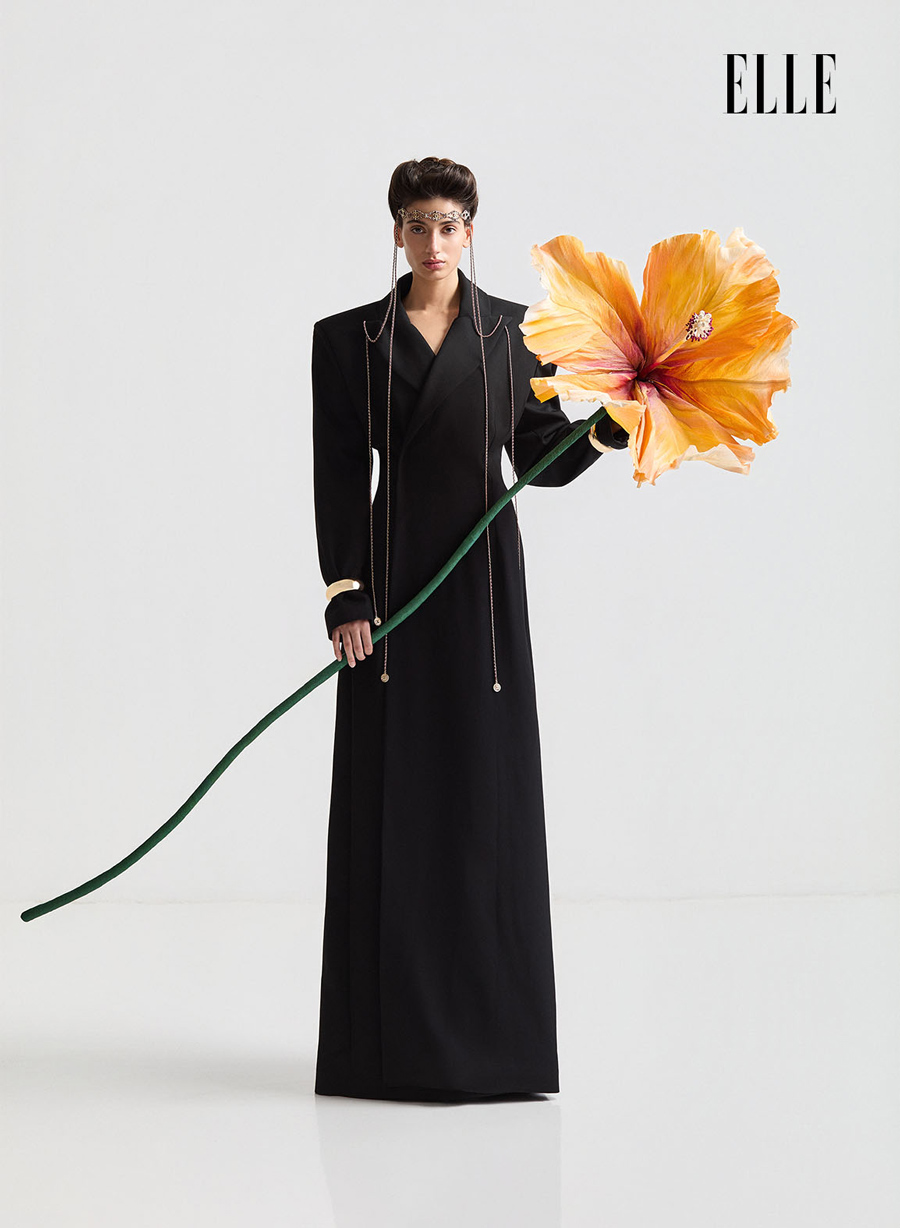 Body IOANA CIOLACU, sacou THE FRANKIE SHOP, tocă AXENTE, cercei ZARA.