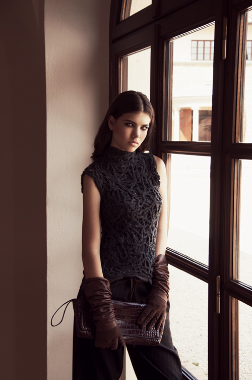Top din satin, 3.100 lei, top din piele de piton, 11.150 lei, pantaloni din lana si bumbac Melange, 2.250 lei, palton din casmir si lana flanel, 12.800 lei, cizme din piele de vitel cu insertii flanel si aplicatii metalice, 5.900 lei, toate Brunello Cucinelli.