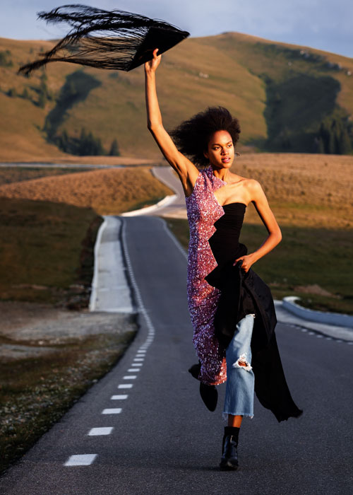 Hanorac din bumbac și palton din lână și mătase, ambele Philipp Plein, jeanși Levi’s 501, 580 lei, ochelari de soare, Christian Roth, 1.610 lei, magazinul Entrance, borsetă din piele, Louis Vuitton, cu prețul la cerere, șosete tradiționale românești din lână, 35 lei, și pantofi din piele, Salvatore Ferragamo, disponibili prin magazinul Casa Frumoasă Radisson Ladies.
