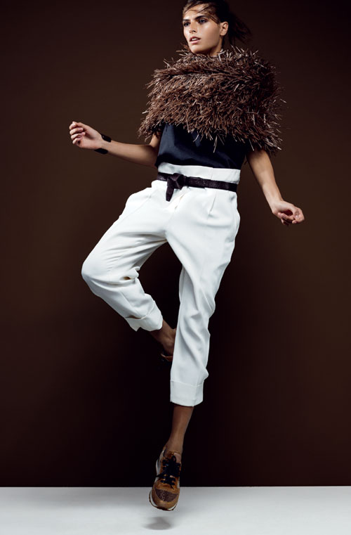 Vesta din blana de vizon perforata, pantaloni din organza, curea din piele si pantofi din material textil, toate Brunello Cucinelli, cu pretul la cerere.