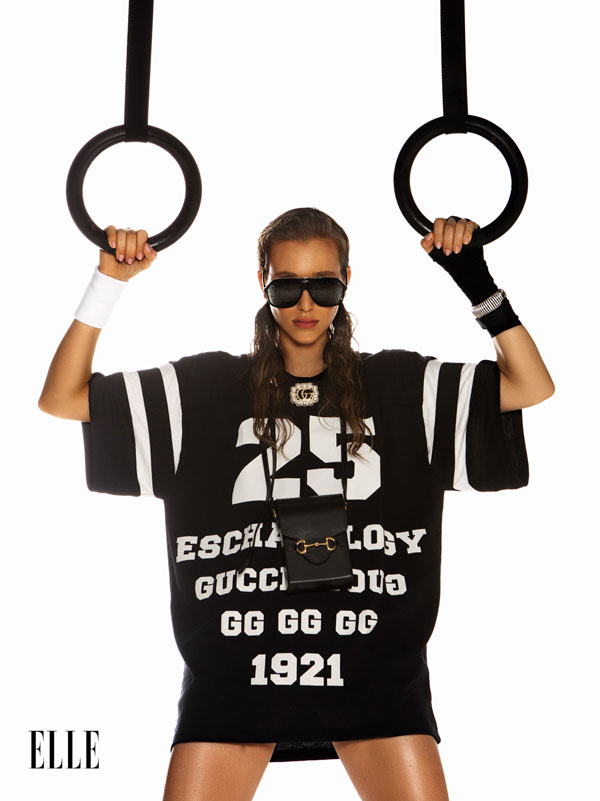 Maiou, H&M, 39,90 lei; colier, 1.690 lei, lanţ cu pandantiv, 449 lei, inel, 595 lei, cercel singular, 279 lei, set trei cercei, 545 lei, toate Swarovski; banderolă, Jordan, 120 lei; colanți, Moncler, 1.553 lei, magazinul MENGOTTI; bandă pentru încheietură, Jordan, 169,99 lei.