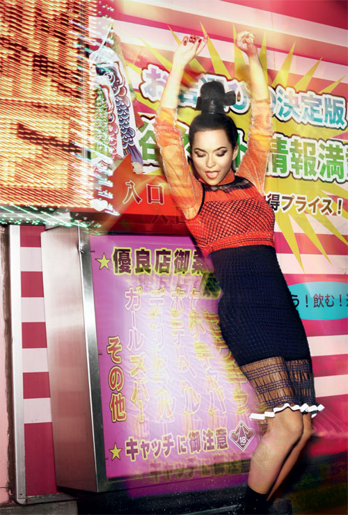 Rochie din matase si plasa, David Koma, www.stylebop.com, ciorapi din latex, Atsuko Kudo, inel, Valentino, si pantofi din piele lacuita, Oscar Tiye.