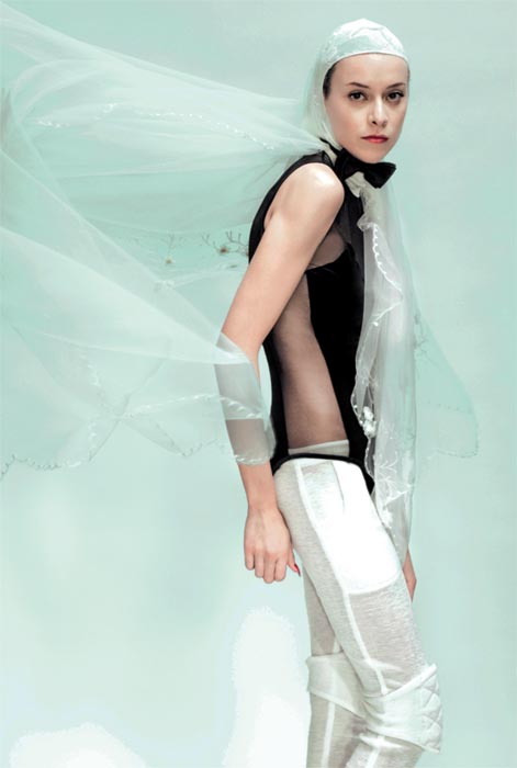 Bluza din satin, Dolce & Gabbana, 736 euro, rochie din bumbac, Giambattista Valli, 1.644 euro, botine din piele si material textil, Fendi, 559 euro, curea din piele si material textil, Fendi, 195 euro, toate magazinul Mengotti; voal de matase, Agnes Toma, 1.450 lei, manusi din voal de matase, 124 lei, ambele magazinul Alb si Negru Exclusiv; cagula din matase, Florin Dobre, 89 lei.