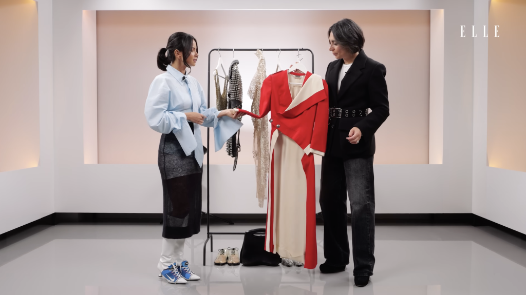 „Una dintre ele este pe mine.”, a mărturisit cântăreața. „Am început să apreciez foarte mult The Baby Blue Shirt. În călătoriile mele din ultimii doi ani de zile, mi-am dat seama că cea mai folosită este această cămașă. Mă rog, nu asta neapărat, dar o cămașă bleu care o combin în fel și chip. (…) Mi-a fost foarte greu să aduc doar piesele astea. Am renunțat cu greu la celelalte, dar le-am ales pe câteva dintre ele să aibă o legătură chiar și între noi două, dacă vorbim de piesa asta, pe care am cumpărat-o împreună. Și pe care am purtat-o la una dintre edițiile ELLE Style Awards. Și pe scenă, foarte mult. Da, și la ediția Vocea României Junior.”, a povestit aceasta despre un blazer Alexander McQueen roșu, o piesă spectaculoasă, inspirată parțial din estetica militară a altor secole, a cărui parte din spate amintește de un frac, dar care se prelungește până la pământ.