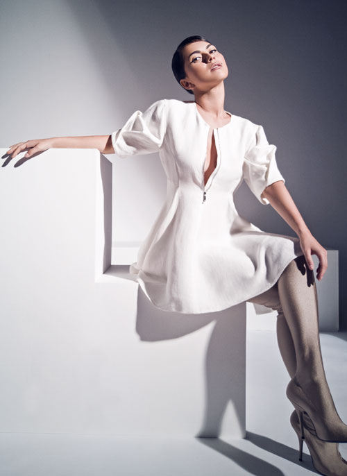 Camasa din poplin, 3.722 lei, jacheta fara maneci din bumbac cu brose aplicate, 10.761 lei, ambele Ermanno Scervino, si cizme Balenciaga, 1.095 euro, www.mytheresa.com.
