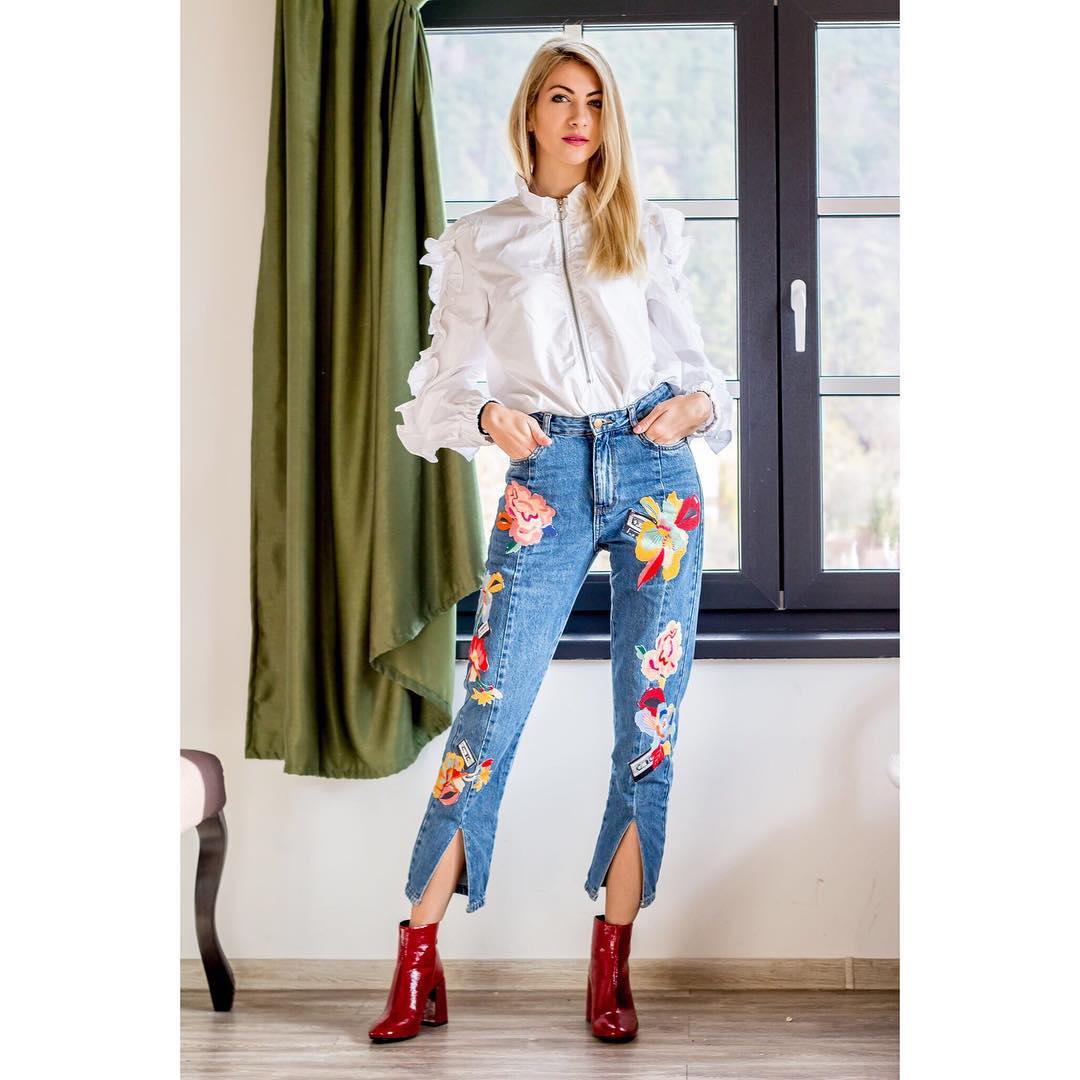 Domnica Margescu: "Jeansii sunt foarte cool si foarte bine taiati, iar in combinatie cu camasa alba si botinele rosii se incadreaza perfect in tema noastra numita Jeans Couture."