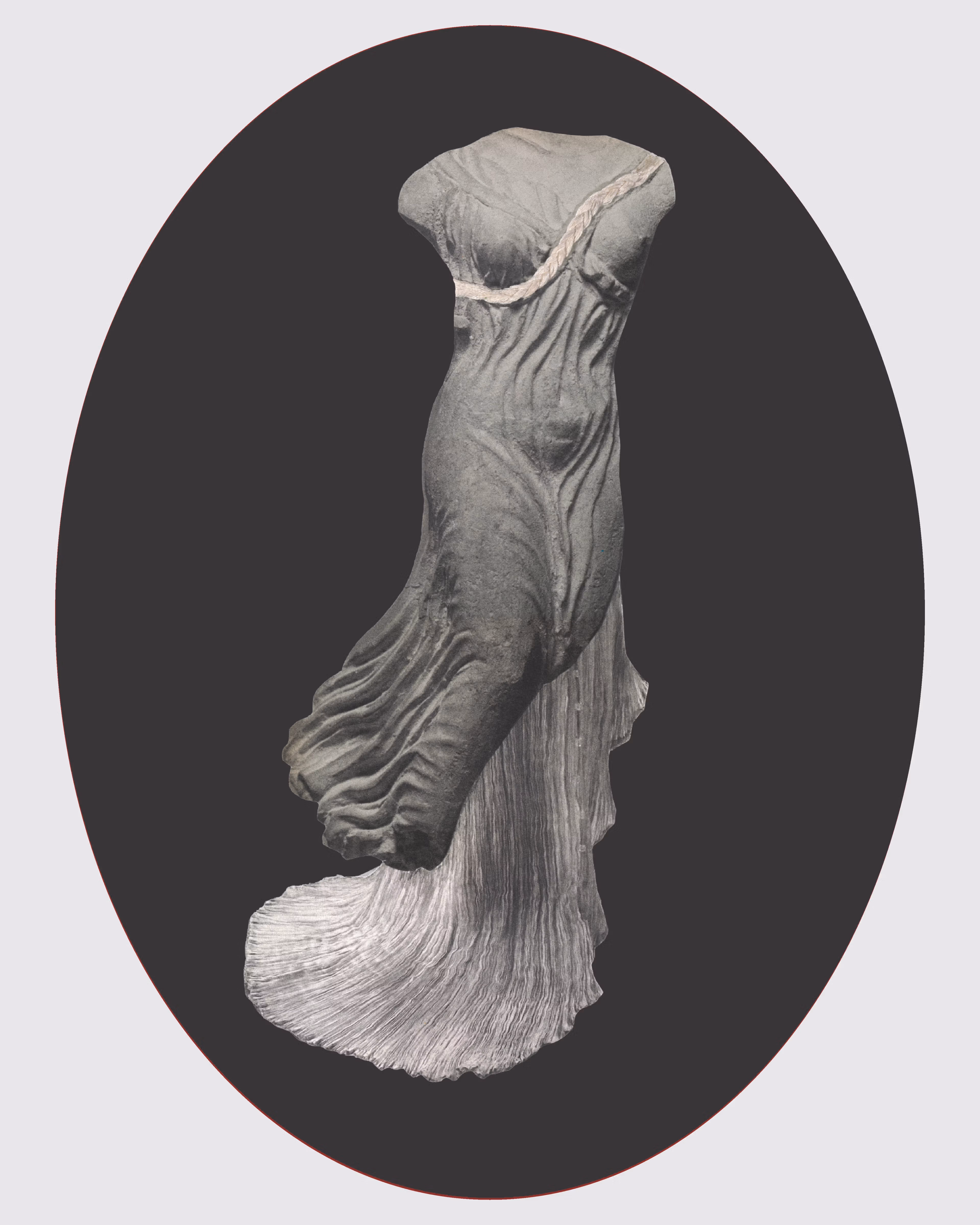 Colaj: Rochia Delphos de Fortuny, Adèle Henriette Elisabeth Nigrin Fortuny și Mariano Fortuny y Madrazo, The Metropolitan Museum of Art, New York, Gift of Frances J. Kiernan, 2005 (2005.328); statuetă de teracotă cu Nike, personificarea victoriei. The Metropolitan Museum of Art, New York, Rogers Fund, 1907 (07.286.23). De Julie Wolfe.