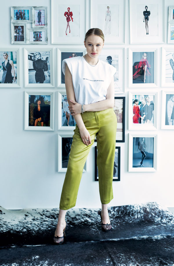 Gina poartă tricou Silkplicity, pantaloni Zara și pantofi Bottega Veneta.