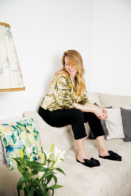 Laura poartă jachetă vintage, pantaloni Zara, slippers Papucei.